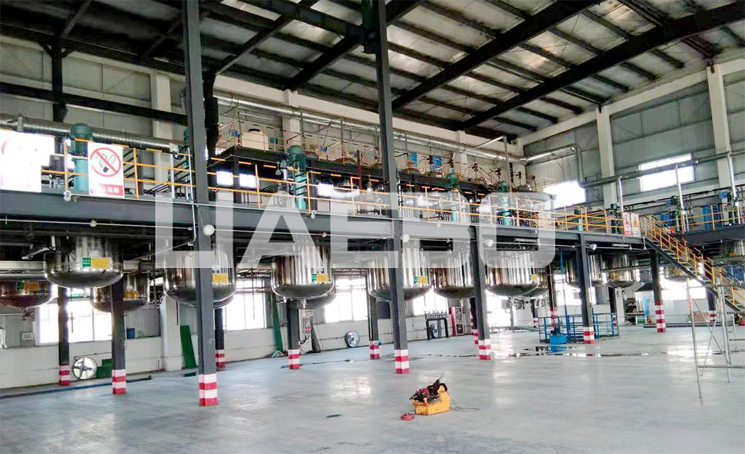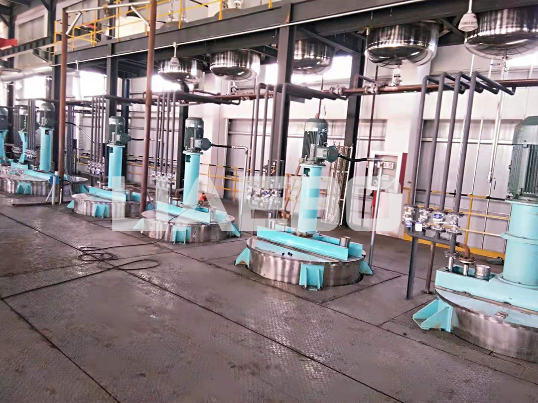 水性乙烯基高防腐涂料生產線,年產2萬噸成品,專業電廠防腐涂料,工藝要求高,生產過程對溫度、分散力度都有特別的要求,設備設計附加分散盤釜內升降,滿足不同層面固液混合需求,解決分散不均衡的問題。自動配料、粉體隔層投放、釜蓋密封設計,解決了配料、品質、環保、安全等一系列重要問題。