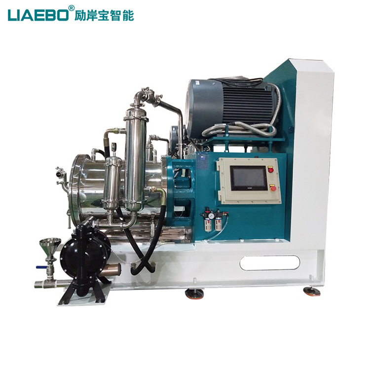 采用循環研磨工藝,環保節能、勞動強度小。配制好的原始漿料,經過第一遍粗略研磨后,泵入循環攪拌罐,經底部泵輸送進入納米研磨機;一邊經過研磨后送入循環罐,與未曾研磨過的物料通過攪拌機快速混亂,一邊又通過底部泵入砂磨機,周而復始直到達成研磨要求。一般而言,罐的容積是砂磨機流量的1/4。采用循環研磨工藝或多次研磨工藝能使產能提高,產品顆粒級配分布得以優化。稍加一些控制功能,可保證產品的可復制性及節省成本。大尺寸轉子加上筒狀縫隙式分離器,使該型設備可使用不同材質小顆粒珠子。對于防金屬污染的物料,可采用陶瓷(碳氮化硅,氧化鋯)及聚氨酯結構材料。