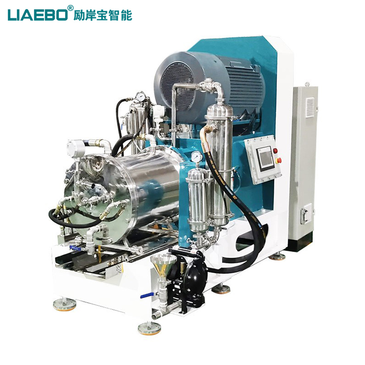 盤式臥式砂磨機是一款連續工作方式的密閉式濕法研磨設備。設備操作簡單,可靠性好,規格齊全,是市場上應用為普遍的濕法研磨設之一,性能和結構非常成熟;密封結構采用雙端面機械密封,并配有雙端面機械密封冷卻系統,具有可靠性和耐用性;帶溫度和壓力的監控和保護,能夠確保產品品質;選用氧鋯珠,具有研磨效率高、研磨細度好、使用范圍廣和耐磨性好的優點。盤式臥式砂磨機隔膜泵將料罐內的物料與研磨腔形成循環研磨。腔內高填充率研磨介質受到撥盤旋轉帶動產生各個方向的力并不規則運動,物料中的顆粒受到研磨介質不斷的碰撞及摩擦,同時,篩網使物料和研磨介質分開,物料不斷的從料罐到研磨腔循環流動,實現粒徑變小,粒徑范圍變窄的目的。